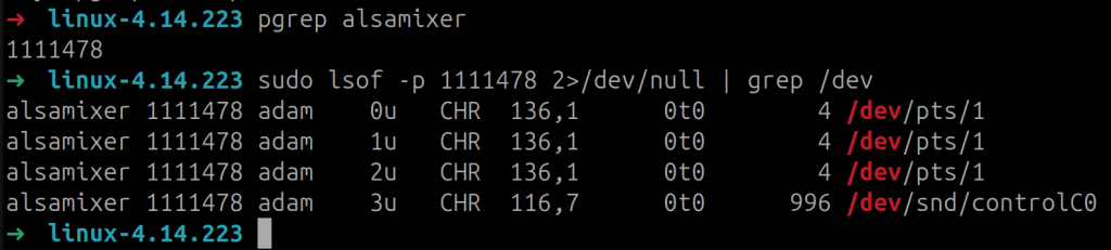 That said, my basic understanding was that this mechanism is used by utilities like alsamixer to manage system sound. To confirm this, I launched a copy of alsamixer, checked it’s open file handles, and saw it was accessing /dev/snd/controlC0. This occurred when I started adjusting sound card related settings on my laptop (see Figure 1).