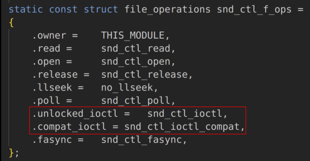 Figure 3: The snd_ctl_f_ops structure defined in control.c that is leveraged to define the respective IOCTL handlers for 32-bit and 64-bit IOCTLs.