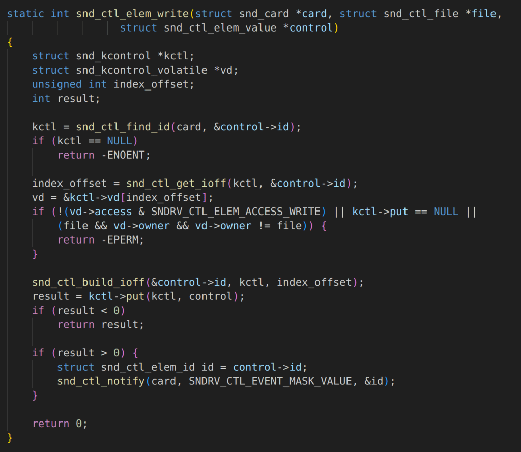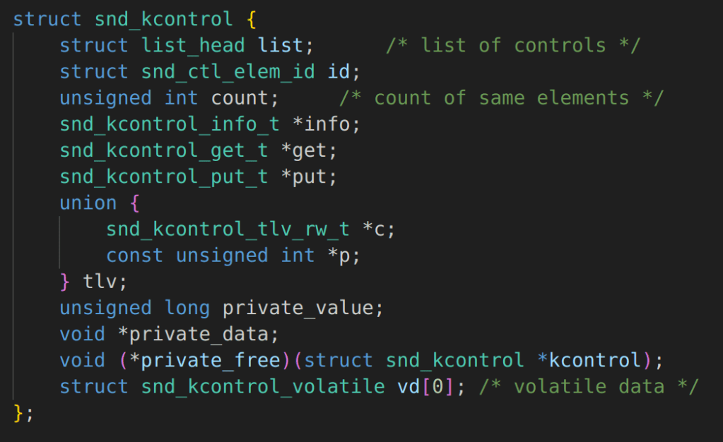 During my research, I couldn’t find any easily accessible or detailed documentation explaining how this subsystem works. Honestly, when it comes to vulnerability research, you don’t always need to fully understand the purpose of the system you’re exploiting. If you can construct the right primitives (or write primitives 😆) and build an exploit chain, a deep dive into the functionality—like how sound control works in the Linux kernel—often isn’t necessary.