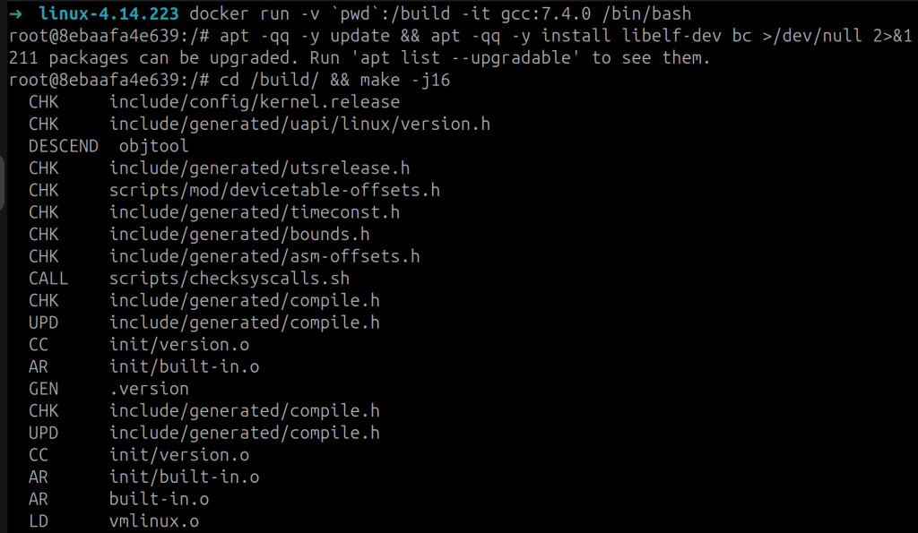 From my testing, I’ve found that building the older-versions of the Linux kernel is rather tightly coupled with the version of GCC used to build the application. Building older kernel versions with newer versions of GCC resulted in errors at compile time. In order to work around this issue, I leveraged Docker to download an older version of GCC from DockerHub. Typically, I’ll try to target a version of GCC that was released sometime around when the kernel version I’m trying to compile was released. This allowed me to successfully build the kernel without issue (see Figure 12).