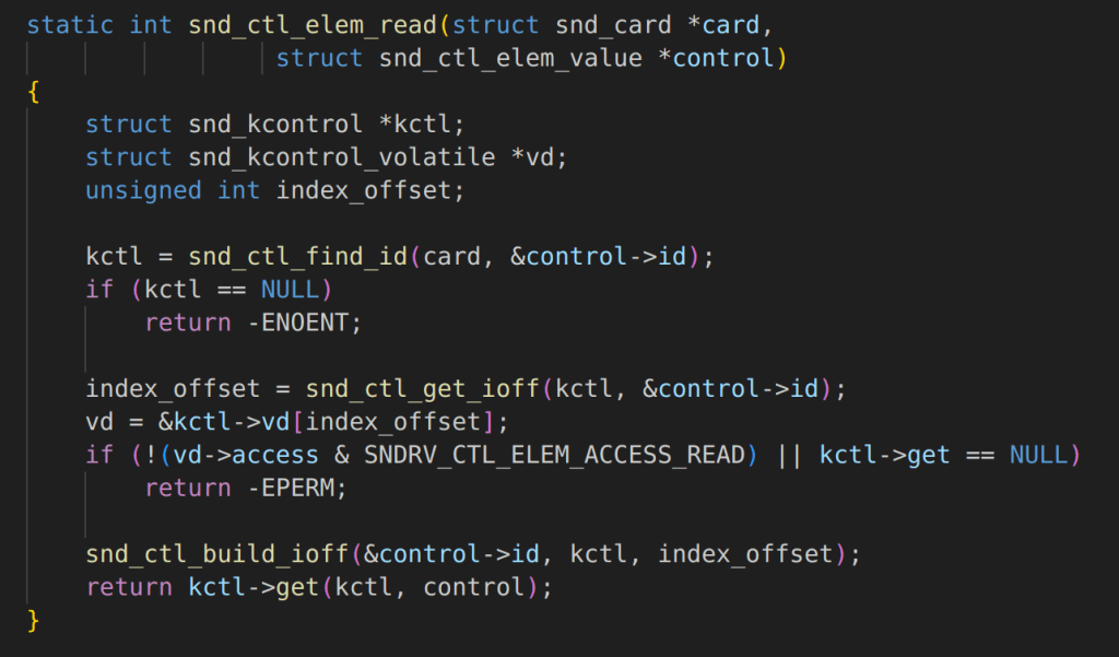 At this point, we know that there is something suspicious going on and that proper locking isn’t being used, but this doesn’t always have security implications. It could be a simple bug. However, digging deeper we quickly realize there are some serious security implications. In both snd_ctl_elem_read and snd_ctl_elem_write we lookup the control object-based on the user-provided data in snd_ctrl_elem_value.