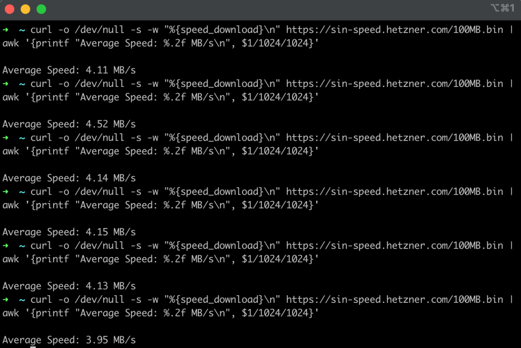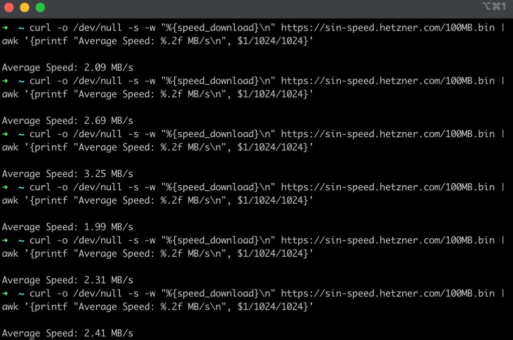 Figure 4: An example set of tests performed using curl testing download speeds downloading a 100 MB test file from Singapore with an average speed of around 2.0 MB/s.