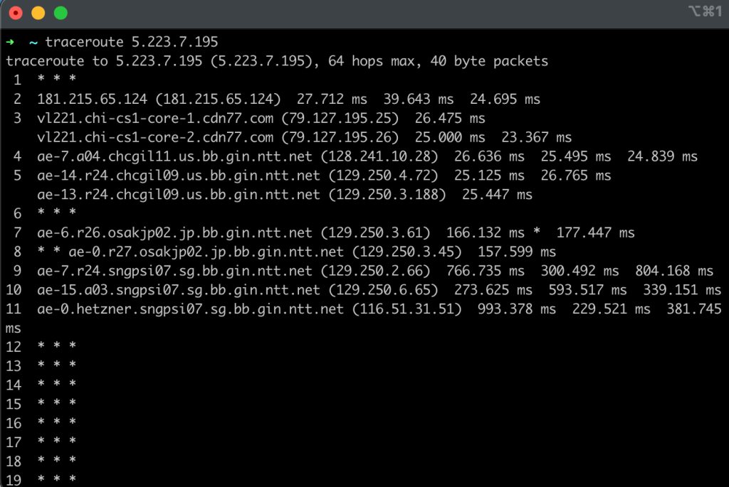 Figure 5: A traceroute to the Hetzner region in Singapore from my connection in Iowa without routing the traffic through any sort of VPN in order to modify how the traffic is routed internationally.