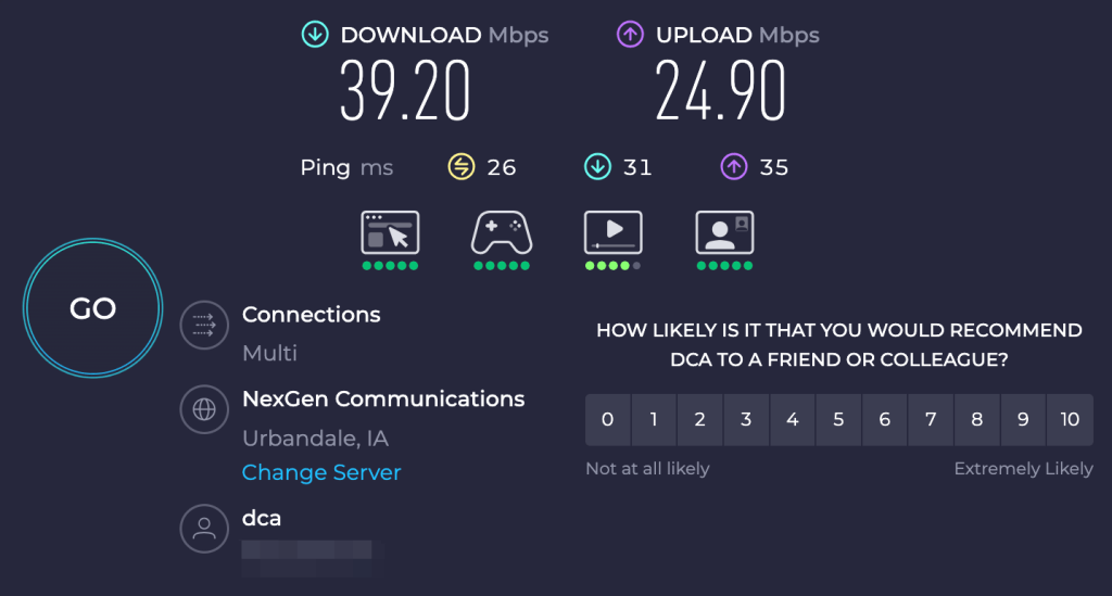 Figure 1: An Internet speed test I ran from my parent’s house in rural Iowa which leverages a line of site connection that typically averages around 40 mbps download speeds through the last-mile to a speed test server hosted on my Internet service providers network.